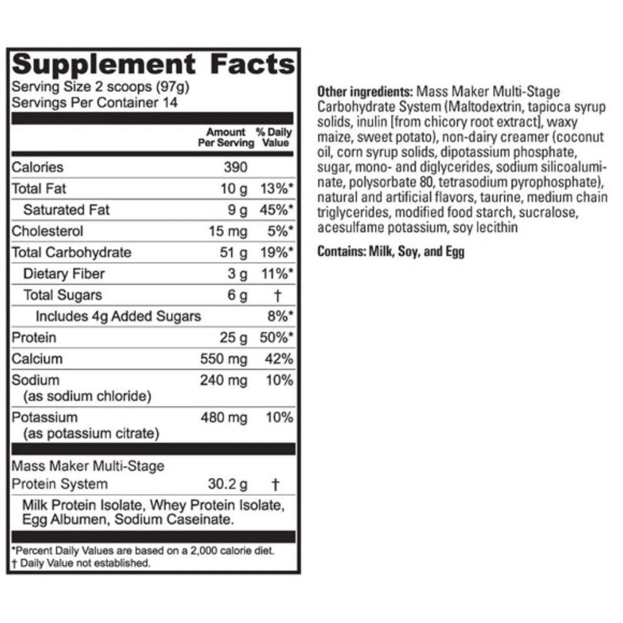 Other Ingredients: Mass Maker Multi-Stage Carbohydrate System (Maltodextrin, Brown Rice Syrup Solids, Inulin [from Chicory Root Extract], Amaranth, Quinoa, Buckwheat, Durum, Millet, Spelt, Barley, Chia), Non-Dairy Creamer (Coconut Oil, Corn Syrup Solids, Dipotassium Phosphate, Sugar, Mono- and Diglycerides, Sodium Silicoaluminate, Polysorbate 80, Tetrasodium Pyrophosphate), Cocoa (Processed with Alkali), Natural and Artificial Flavors, Potassium Citrate, Salt, Medium-Chain Triglycerides, Modified Food Starch, Soy Lecithin, Xanthan Gum, Cellulose Gum, Sucralose, Acesulfame Potassium.