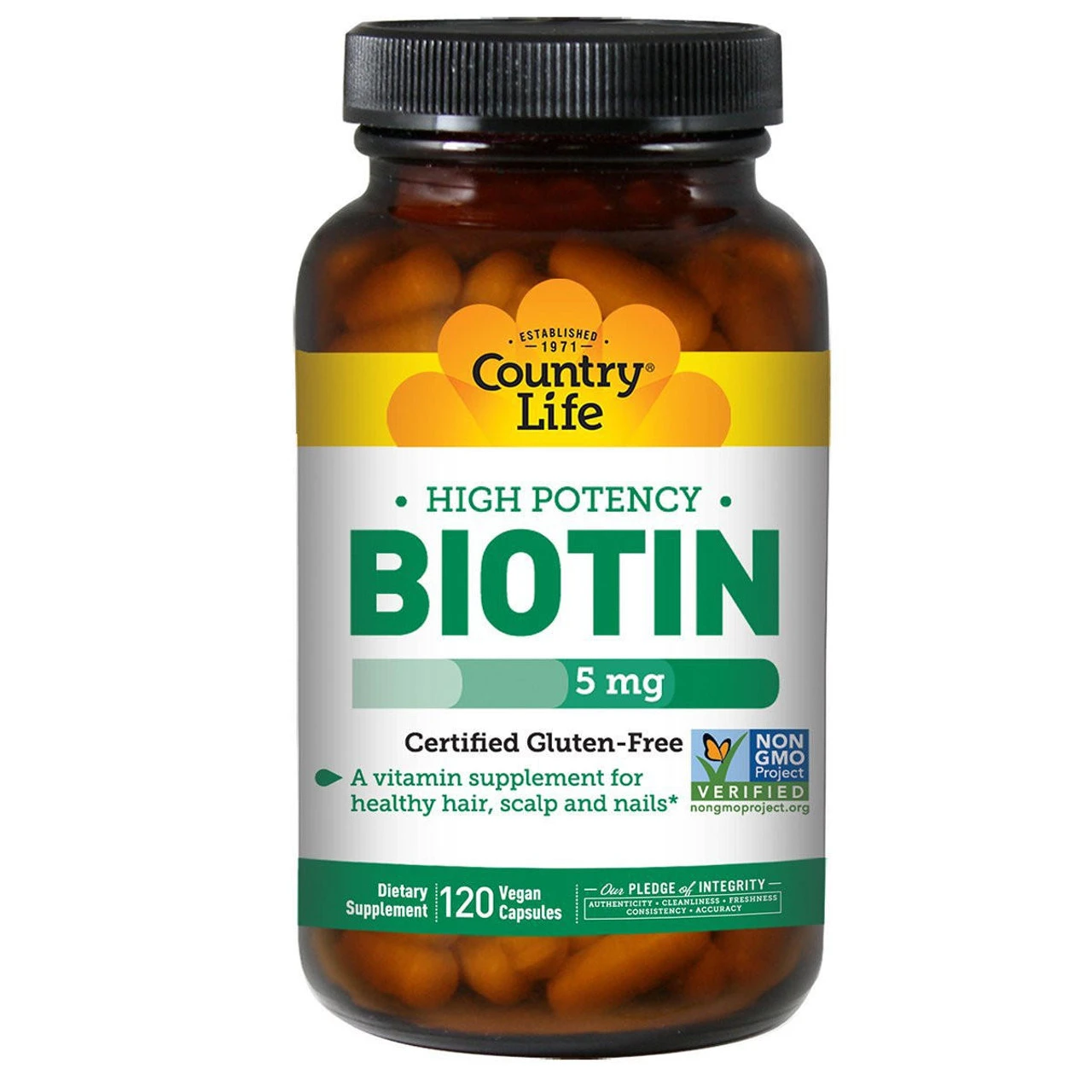 Country Life High Potency Biotin is a high potency vitamin supplement packing 5mg of Biotin per serving to support healthier hair, skin and nails. Country Life Biotin is vegan and vegetarian friendly and Halal.