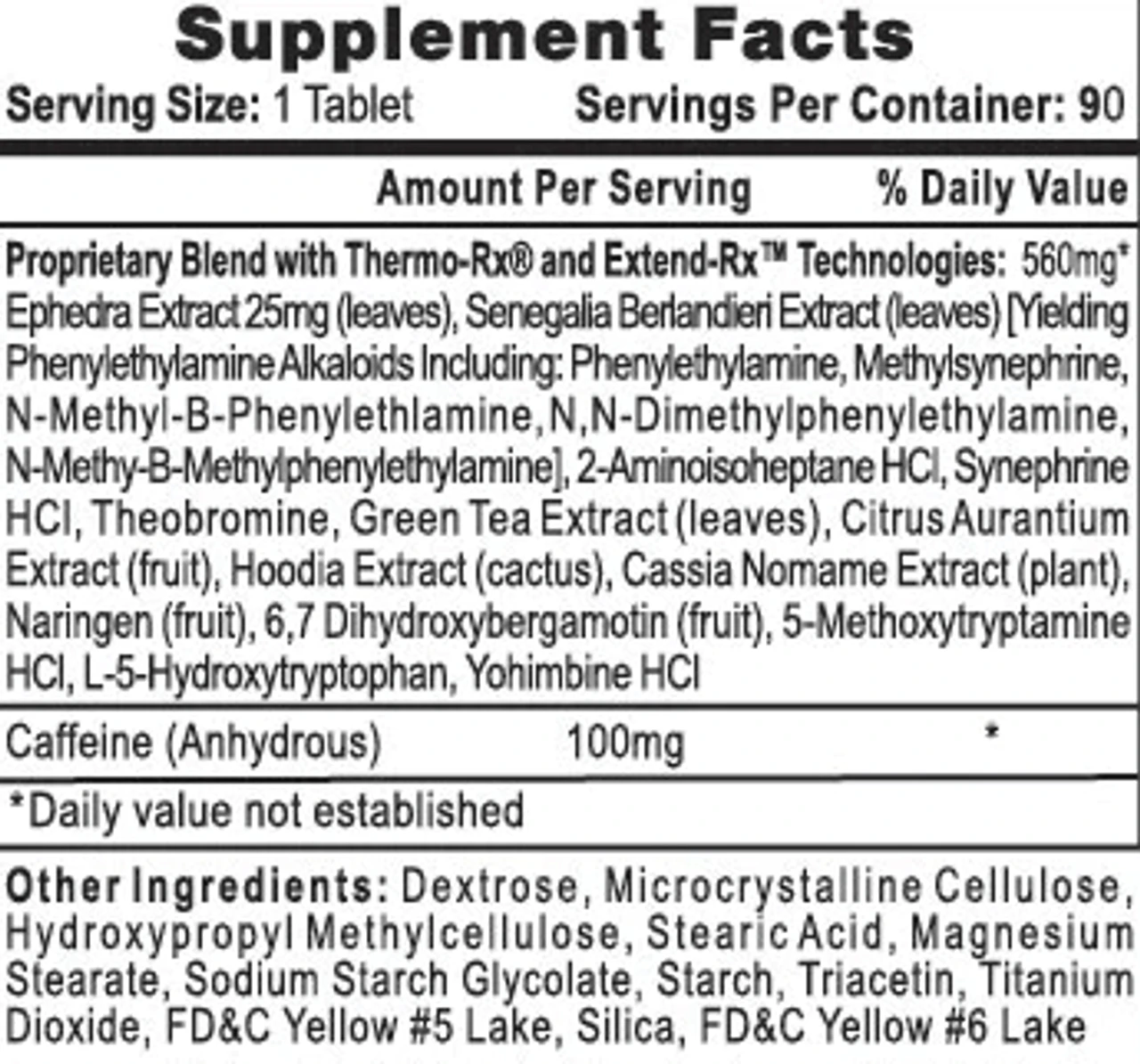 - Ephedra Extract (25mg): Promotes fat burning and appetite suppression. This legal form of Ephedra does not contain banned ephedrine alkaloids.