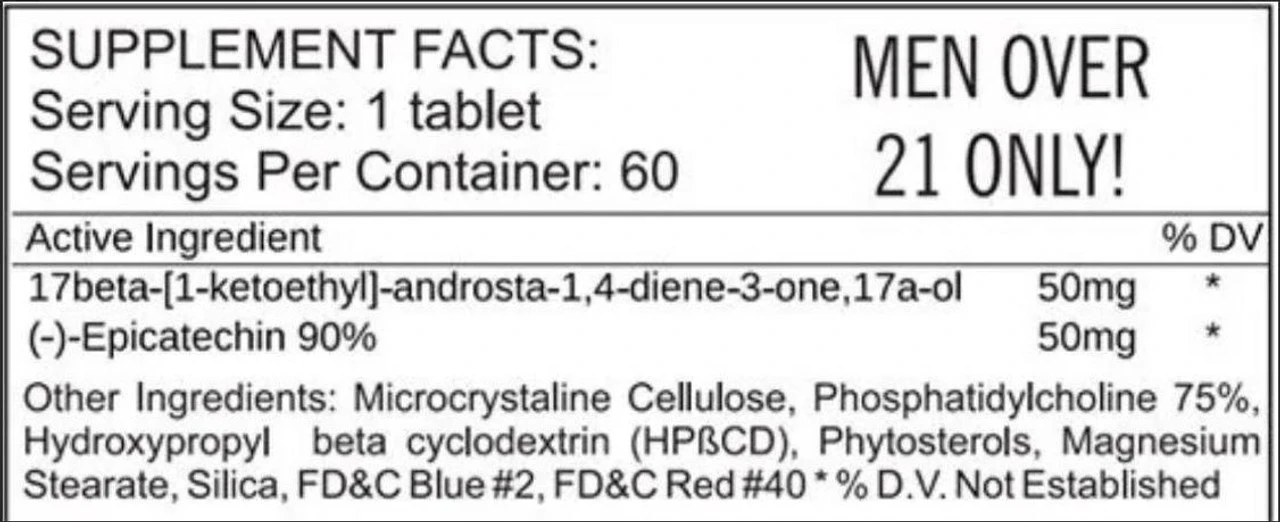 KEEP OUT OF REACH OF CHILDREN. NOT FOR USE BY INDIVIDUALS UNDER THE AGE OF 21 YEARS. Consult a physician or licensed qualified health care professional before using this product if you have, or have a family history of, prostate cancer, prostate enlargement, heart disease, low “good” cholesterol (HDL), or if you are using any other dietary supplement, prescription drug, or over the counter drug. Do not exceed recommended serving. Exceeding recommended serving may cause serious adverse health effects. Possible side effects include acne, hair loss, hair growth on the face (in women), aggressiveness, irritability, and increased levels of estrogen. Discontinue use and call a physician or licensed qualified health care professional immediately if you experience rapid heart beat, dizziness, blurred vision, or other similar symptoms. Made in a facility that may process dairy, peanuts, tree nuts, wheat, fish, barley and shellfish. Do not use if governed by any body that prohibits hormone use.
