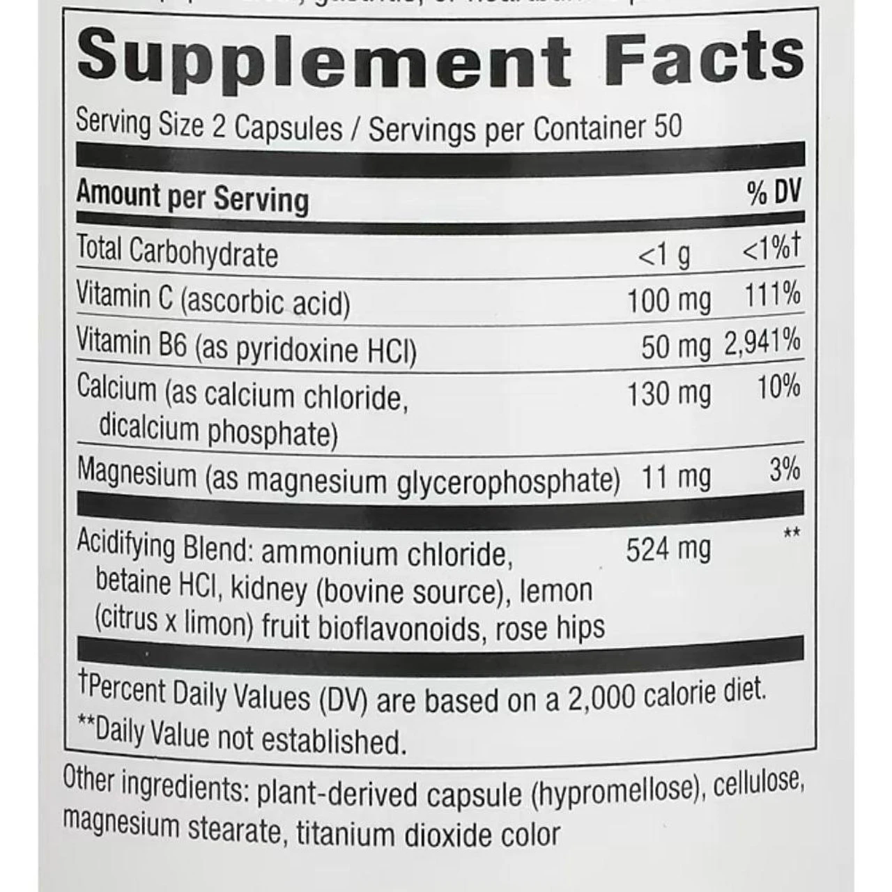Acidifying Blend: ammonium chloride, betaine HCl, kidney (bovine source), lemon (fruit) bioflavonoids, rose (hips) 524mg