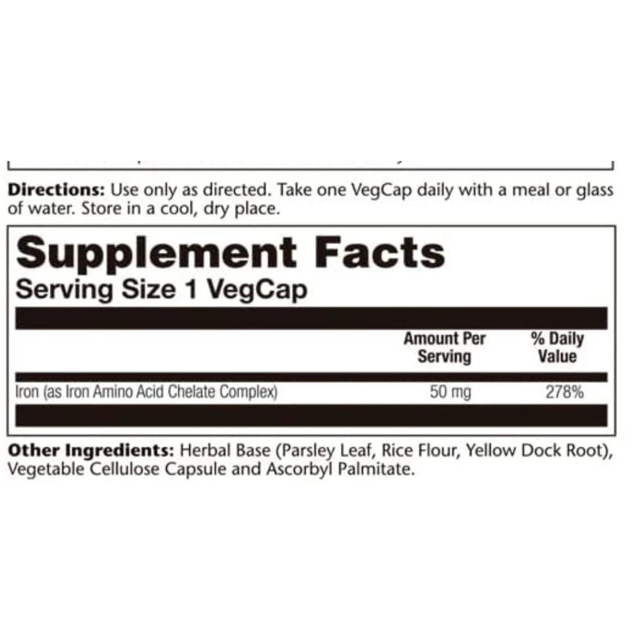 Other Ingredients: Herbal Base (Parsley Leaf, Rice Flour, Yellow Dock Root), Vegetable Cellulose Capsule and Ascorbyl Palmitate.