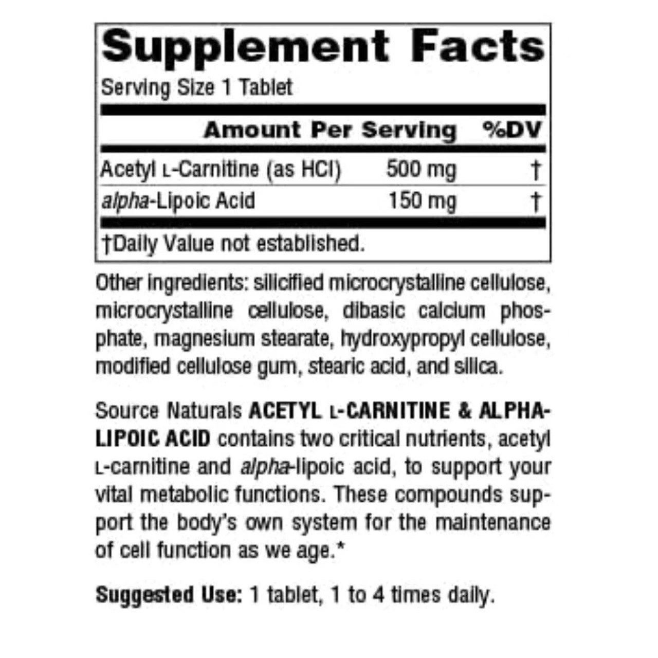 Source Naturals Acetyl L-Carnitine and Alpha Lipoic Acid 650mg 60 Tabs