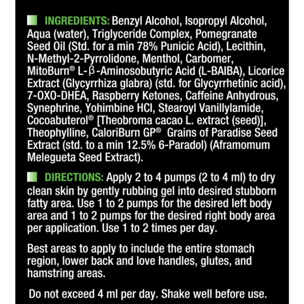 Apply 2-4 pumps to dry clean skin and rub into desired stubborn fatty area. Use 1-2 pumps for the desired left body area and 1-2 pumps for the desired right body area per application. Use 1-2 times per day.